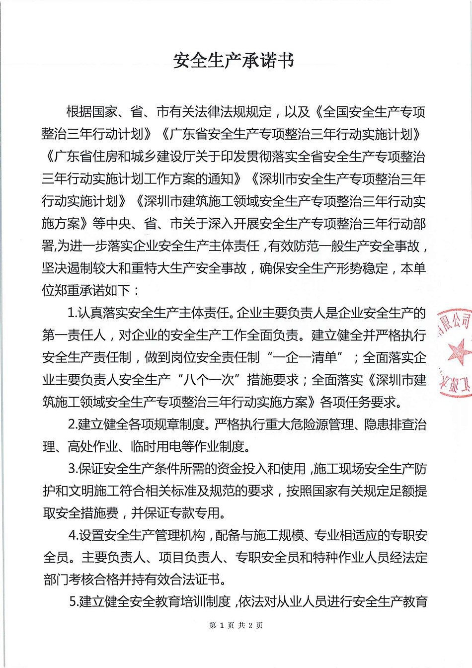根據(jù)《深圳市住房和建設(shè)局關(guān)于抓緊推進(jìn)安全生產(chǎn)專項(xiàng)整治三年行動按時(shí)完成2020年重點(diǎn)任務(wù)的通知》文件精神,我司立即簽訂《深圳市建筑施工安全生產(chǎn)承諾書》并向社會、員工公開。