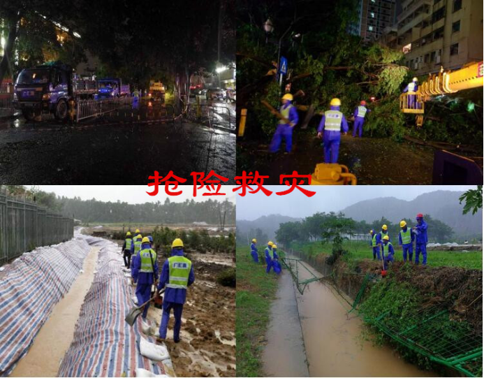 作為深圳市三防搶險專業隊、深圳市三防倉庫管養單位,深圳市廣匯源水利建筑工程有限公司積極響應深圳市及各區號召,提前做好了各項前期籌備工作。組建搶險專家隊伍、集結搶險人員、籌集機械設備、準備搶險物資、等,嚴陣以待、迎戰山竹。臺風暴雨期間,我司搶險專家及人員始終堅守在一線,全力以赴開展了各項搶險救災工作,清除路障,清理河道中的阻礙行洪雜物、邊坡加固等,持續奮戰了一周,及時保障了深圳市道路暢通,及時恢復了人民生產生活秩序。